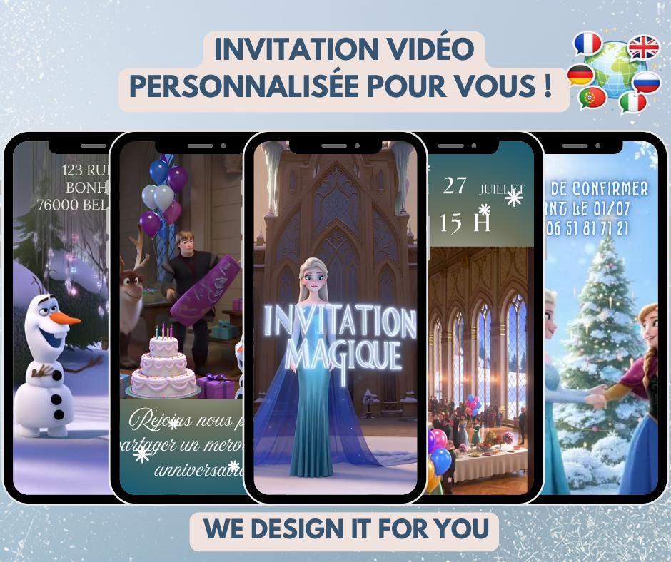 Give a truly original and unforgettable birthday invitation with our personalized Frozen video invitation! ✨ 📝 100% personalized (no stress) 👉 You don't have to change a thing. Multilingual